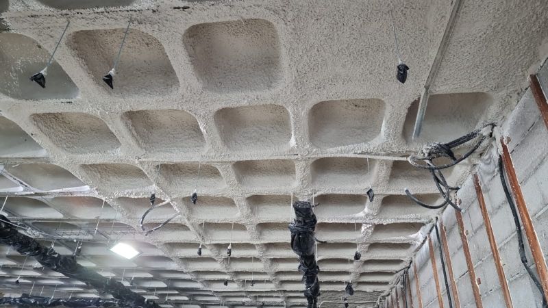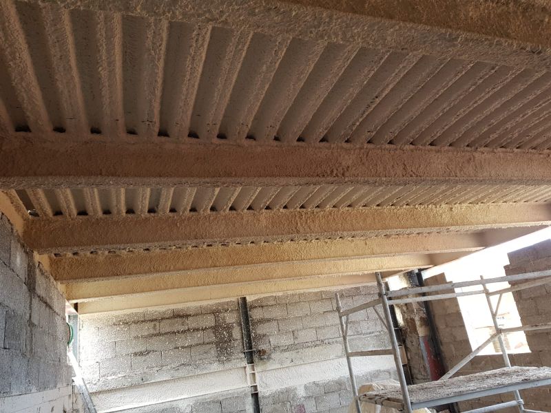 Realizamos la aplicación de mortero ignífugo mediante proyección mecánica para la ejecución de todos los sistemas constructivos para los que el material está ensayado, tanto para protección estructural de acero al igual que la intumescente, como para estructuras y forjados de madera, forjados reticulares, colaborantes, formación de barreras medianeras, trasdosados. Y también en combinación con malla nervometal en los casos en el que el sistema lo requiere.